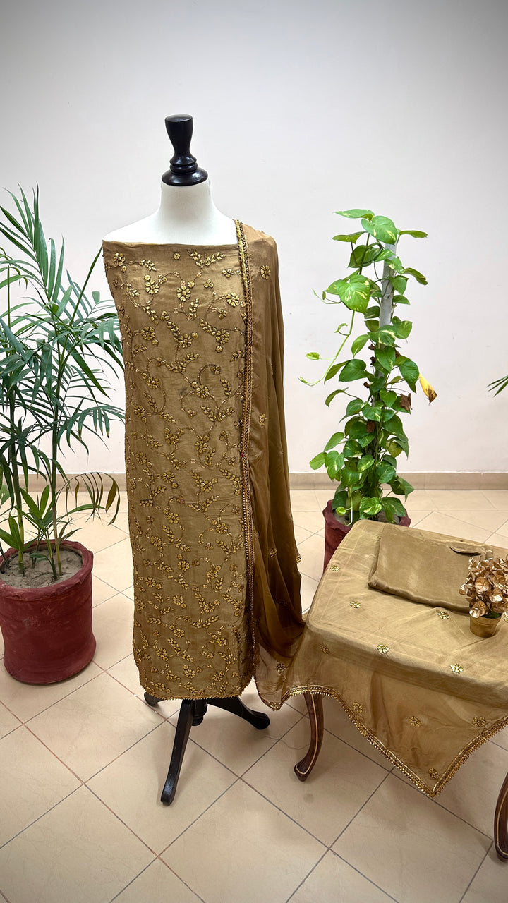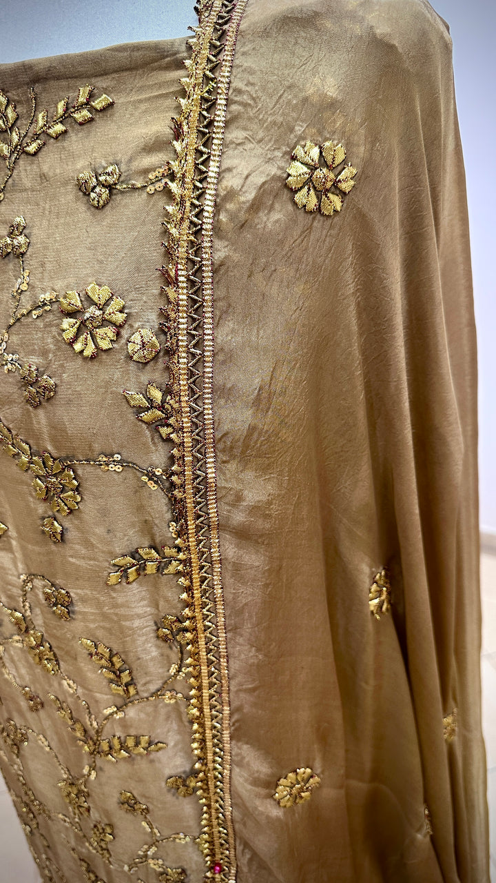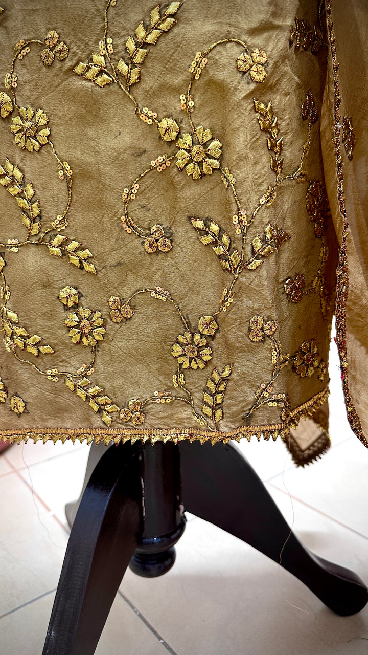 Each detail reflects fine craftsmanship — from the rich texture of the silk to the subtle shimmer of embellishments — making it the perfect choice for festive gatherings, mehndi functions, and evening celebrations.